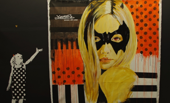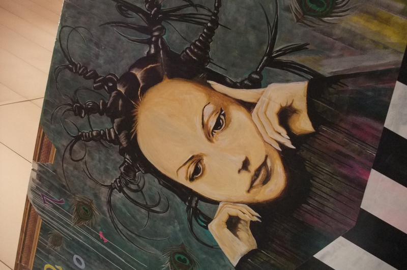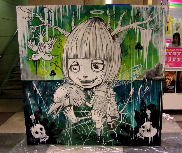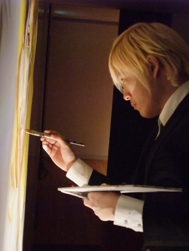 LOFT名古屋1Fロフトマーケットにて2012年10/16(tue)~29(mon)まで2週間に渡りYOICHIRO展が開催され、原画展、グッズ販売に加えて10/20(sat)にはライブペインティングも行われ、穏やかなイメージで進んだペイントもハロウィンシーズンということで、終盤には蝙蝠の仮面の女性へと変化させて終えた。