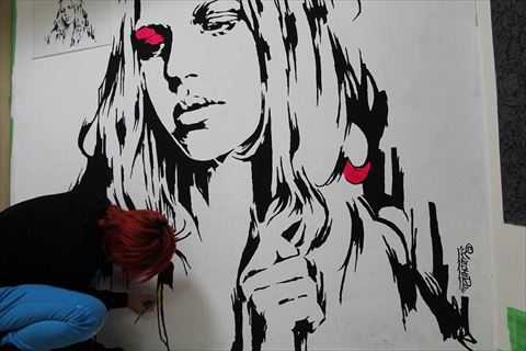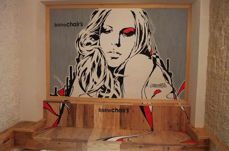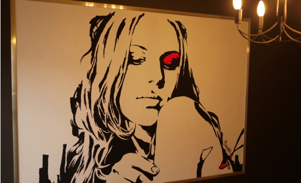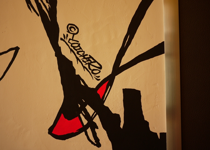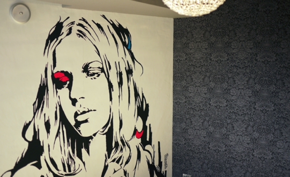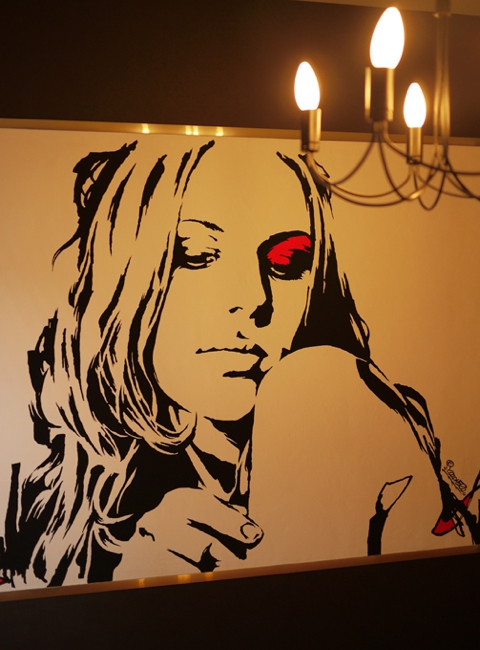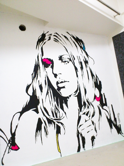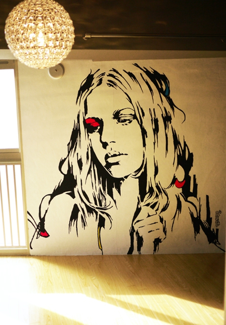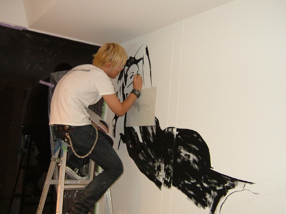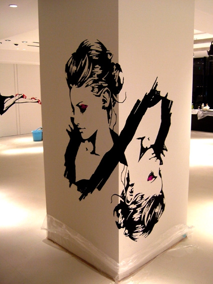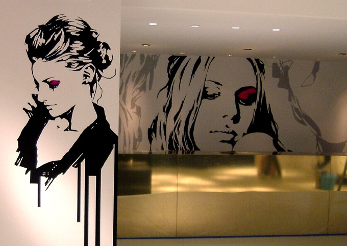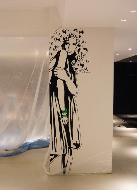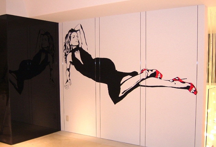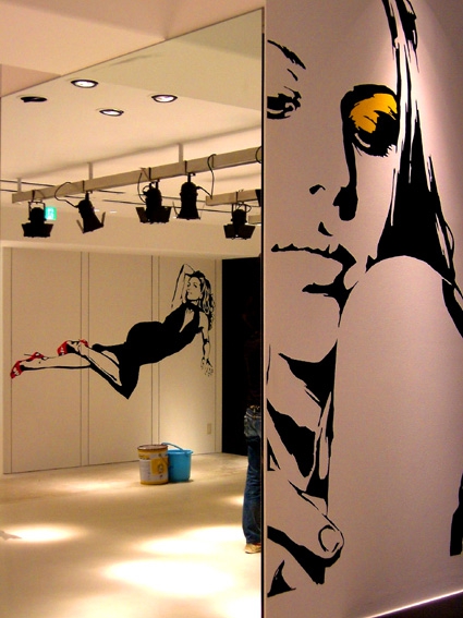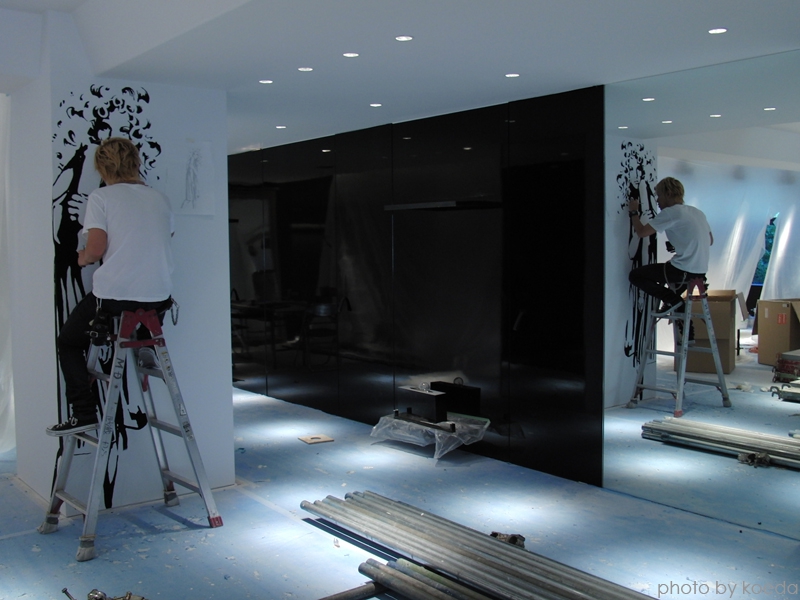 2009年4月から2年間限定でオープンした銀座裏RESTIRの壁を10日間泊まり込みでペイント。ハイブランドを取り扱うセレクトショップということから、モノトーンにワンポイトで挿し色を入れたクールでスタイリッシュな新たな世界観が生まれた。